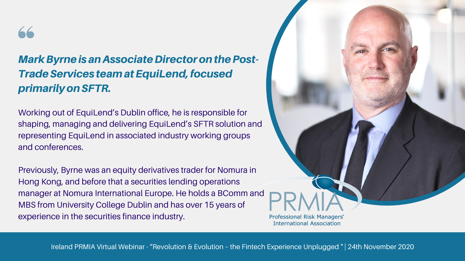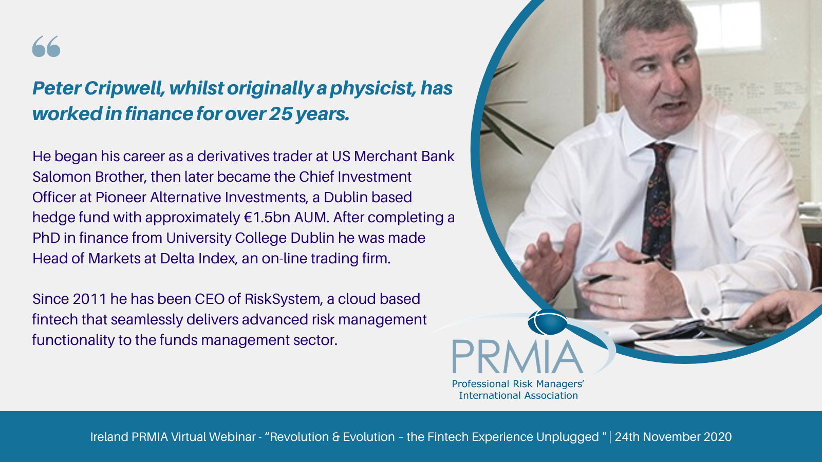 On Tuesday 24th November, 2020 PRMIA Ireland invited participants to their second webinar of the year - “Revolution & Evolution – the Fintech Experience Unplugged”. As the Co-Regional Director of PRMIA Ireland Alan Bluett invited interested parties to participate.